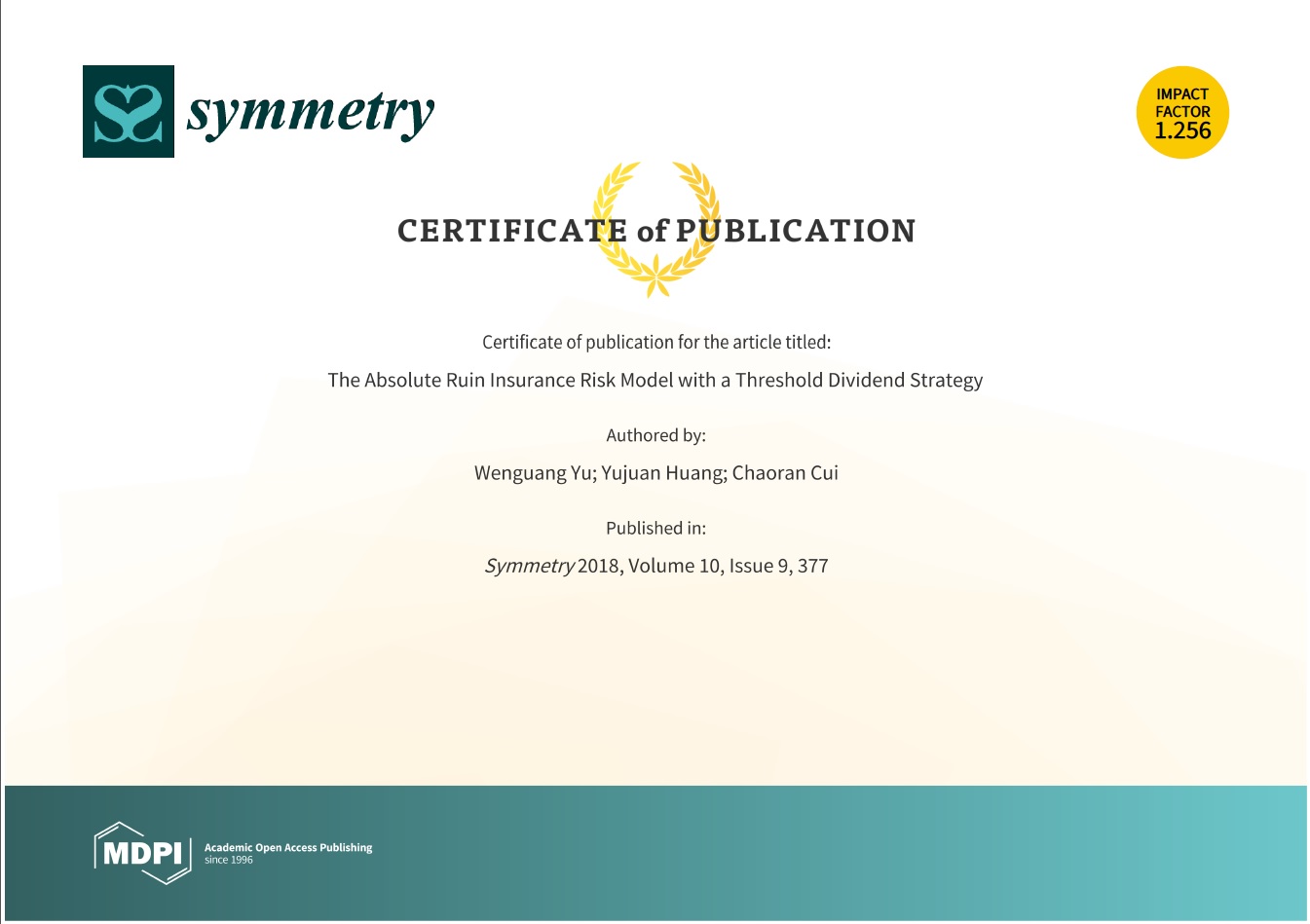 近日,新澳彩论坛于文广教授以第一作者和通讯作者身份在A1类期刊《》2018年9期10卷上发表论文《The Absolute Ruin Insurance Risk Model with a Threshold Dividend Strategy》,该期刊JCR分区为2区,影响因子高达1.256。这是于文广教授本年度发表的第二篇A1类论文。第一篇论文《基于年龄与工资水平差异的延迟退休对我国养老保险基金收支平衡的影响》于2018年2月在《中国软科学》上发表。