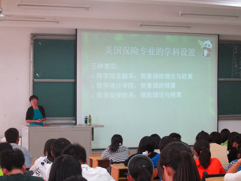 刘素春首先讲述了中国高校保险教育的发展历程,通过分析社会经济大环境指出了保险行业存在巨大的人才需求缺口,让新生们感受到保险专业良好的就业前景;接着,刘教授介绍了美国高校保险专业排名和保险学科设置类型,并从学习、生活、文化、三方面讲述了自己的访学感受,从中我们可以体会到中美大学生的差异,如美国大学生在学习上习惯自主学习;生活上独立自主,自己打工挣生活费。中国儒家文化的长幼尊卑与主张平等的美国文化差异。