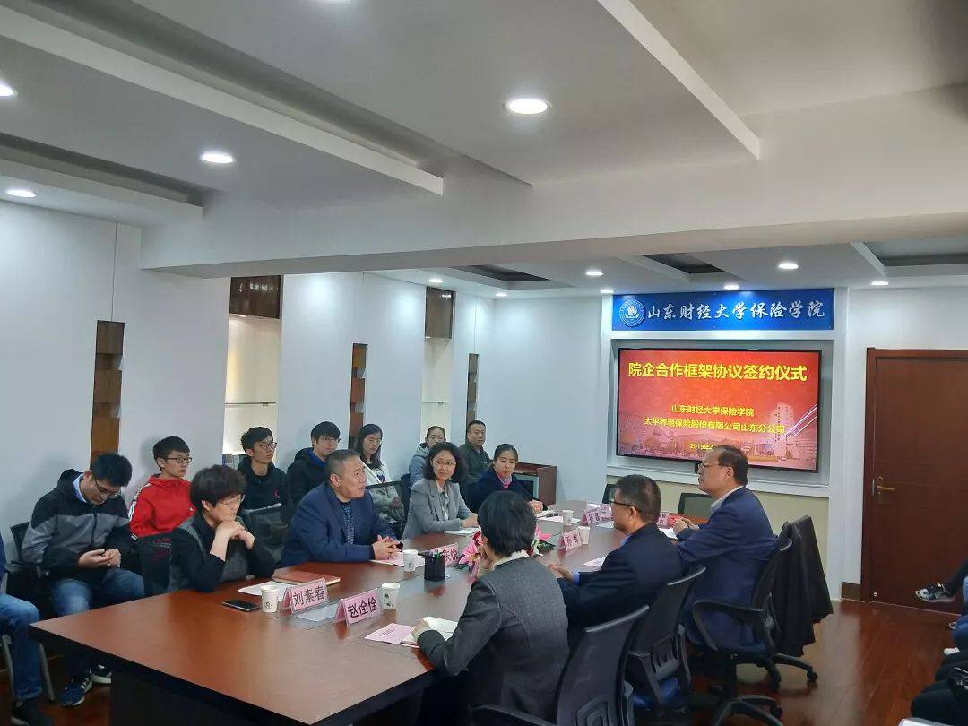 4月10日下午,新澳彩论坛 与太平养老保险山东分公司院企合作框架协议签约仪式在学院会议室成功举行。新澳彩论坛 院长闫庆悦、太平养老山东分公司总经理孙辉、太平养老山东分公司助理总经理徐斌、团险管理部总经理高文东、济南本部负责人赵佺佺、学院教授代表杨文生、团委书记孙磊及研究生共30多人出席了本次仪式。本次签约仪式由副院长刘素春主持。