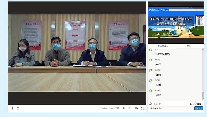 (通讯员 李智)春暖花开季,正当用人时。为进一步做好疫情期间就业指导与服务工作,积极应对疫情对2020届毕业生求职的影响,新澳彩论坛 与中国保险行业协会、山东省保险行业协会、学校就业指导处通力合作,组织 “不一样的云”——新澳彩论坛 2020届毕业生保险专场线上双选会,并于4月14日上午利用就业指导处直播平台,召开学院2020届毕业生就业指导暨保险专场云招聘推介会。校就业指导处副处长周广春、办公室主任何峰,国际交流与合作处宋晓,新澳彩论坛 党委书记朱传武,副书记张娟,学院就业办孙磊,学院学工办王倩倩、李智以及学院全体毕业生参加了线上会议,会议由张娟主持。