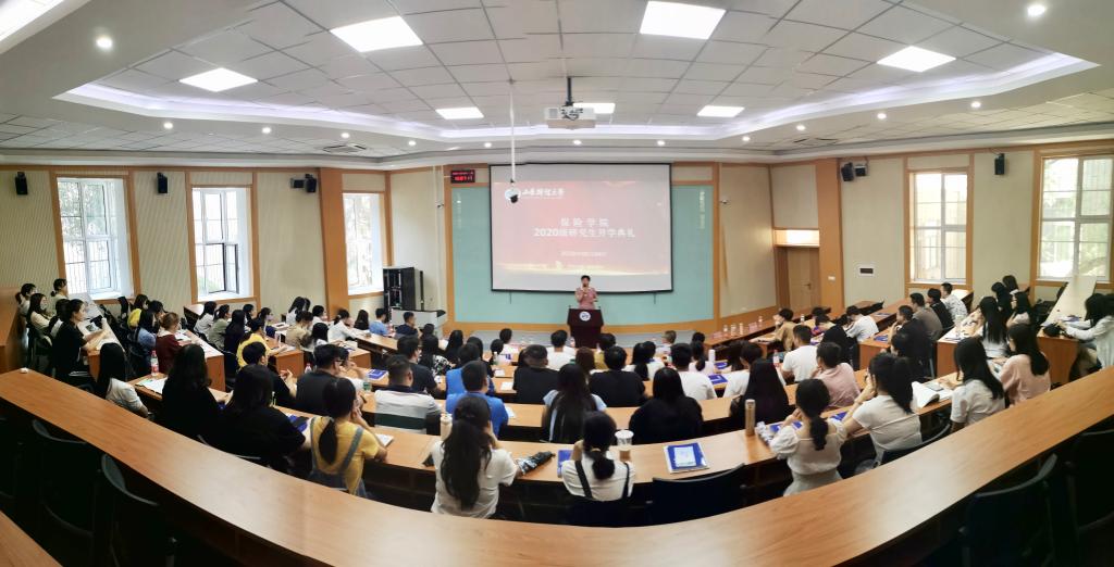 9月4日下午,新澳彩论坛 2020级研究生开学典礼暨新生专业教育讲座在舜耕校区第三阶梯教室举行。新澳彩论坛 党委书记朱传武,院长闫庆悦,特邀嘉宾中邮人寿保险股份有限公司山东分公司党委书记、总经理韩新强,中邮人寿保险股份有限公司山东分公司营业部总经理孟旗,副院长刘素春、于文广,硕士生导师代表孙秀清,研究生辅导员李智,在校生代表和2020级全体研究生参加了本次活动。开学典礼由学院党委副书记张娟主持。