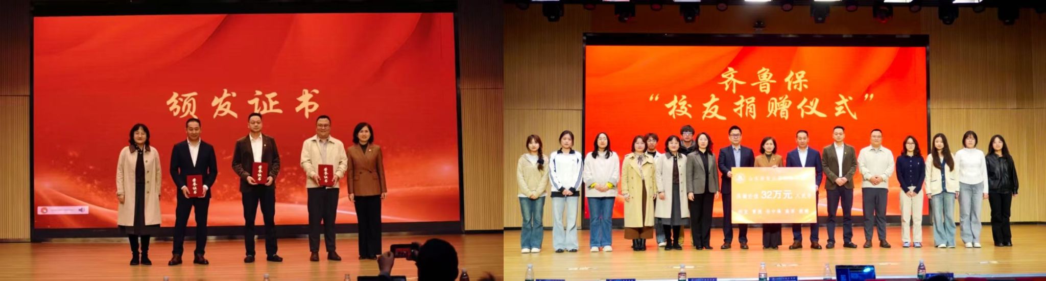 4 月 9 日,新澳彩论坛 “情系母校,共筑未来 —— 齐鲁保校友捐赠仪式” 在章丘校区文化活动中心报告厅举行。新澳彩论坛 党委书记张娟、党委学生工作部副部长刘娟、学院党委副书记王斐斐,学院辅导员,新澳彩论坛 校外导师陈卫华博士,华安财产保险股份有限公司聊城分公司总经理、保险校友会副会长高军,诺诚保险代理有限公司总经理、保险校友会秘书长孙中峰,济南文杰文心信息科技有限公司总经理、保险校友会副秘书长曹植及学院师生代表参加活动,仪式由王斐斐主持。