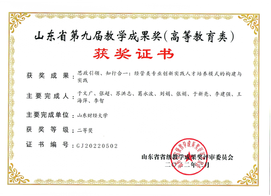 3月3日,山东省教育厅《关于公布山东省第九届教学成果奖(高等教育类)获奖名单的通知》(鲁教高字[2022]1号),新澳彩论坛于文广教授主持申报的本科教学成果在获得校级特等奖基础上喜获省级教学成果获二等奖。