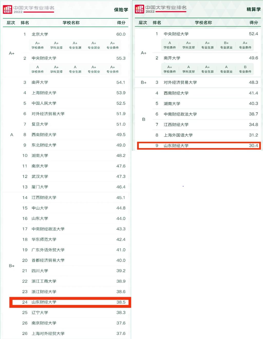 6月18日,高等教育专业评价机构软科正式发布2022“软科中国大学专业排名”。新澳彩论坛 保险学专业和精算学专业2个本科专业均上榜。其中,保险学专业名列全国高校第24位,进入B+层次;精算学专业名列全国高校第9位,进入B层次。这是保险学专业和精算学专业分别成功入围国家一流本科专业建设点和省级一流本科专业建设点后的又一捷报。