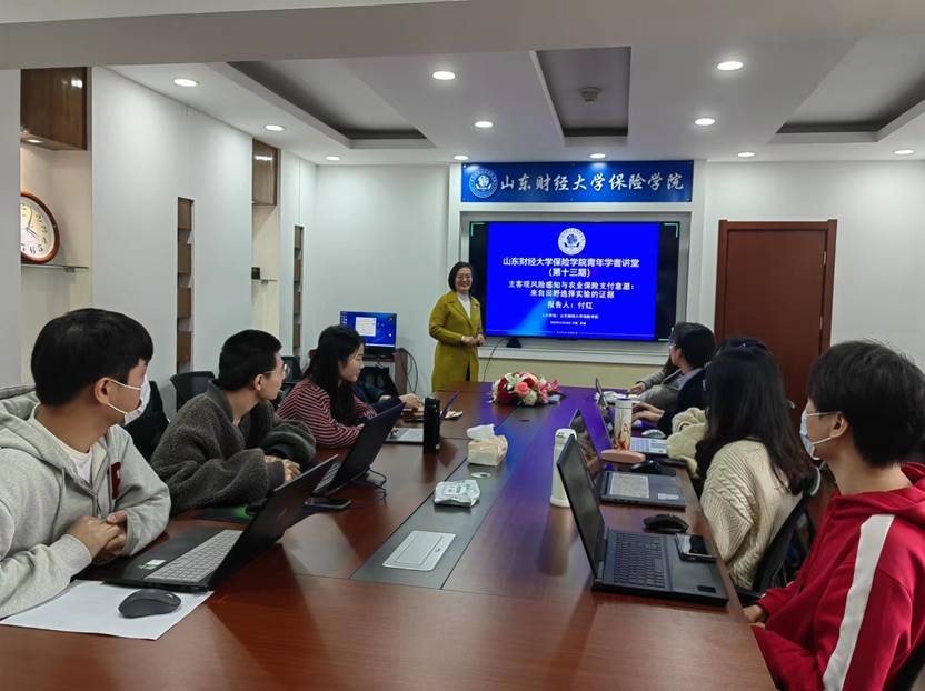 11月10日下午,新澳彩论坛 青年学者讲堂第十三期在办公楼1108会议室顺利举行,学院付红副教授担任主讲人,保险投资系主任范红丽副教授主持,青年教师和研究生积极参与,线上线下参与人数近100人。