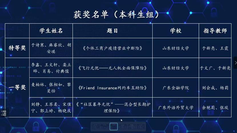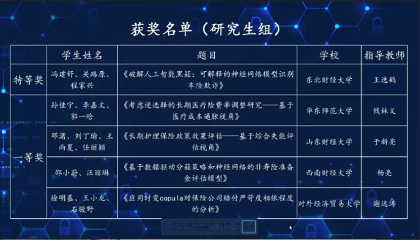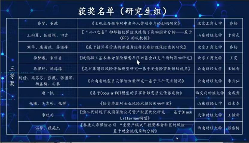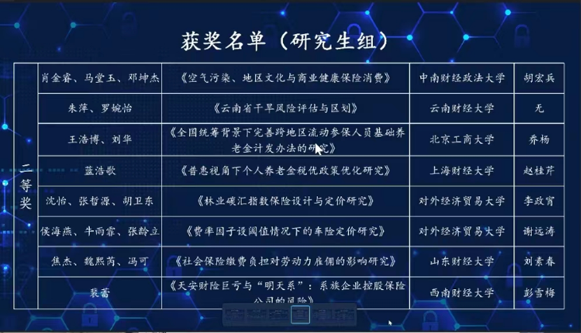 此外,新澳彩论坛两个本科生队、四个研究生团队的竞赛作品分别入选本科生保险产品设计竞赛和研究生风险管理案例竞赛环节,最终斩获佳绩,共获特等奖一项、一等奖两项、二等奖一项和三等奖两项。其中,本科生保险产品设计竞赛中,于诗寒、麻睿欣、胡安琪的参赛作品《个体工商户疫情营业中断险》(指导老师:于新亮、王霞)荣获特等奖,李鑫、王文轩、栾立晔、肖易、付典儒的参赛作品《飞行无忧——无人机全面保障险》(指导老师:于文广、于新亮)荣获一等奖;研究生风险管理案例竞赛中,邓潇、刘丁瑜、王雨夏、任丽颖的参赛作品《长期护理保险政策效果评估——基于综合失能评估视角》(指导老师:于新亮)荣获一等奖,焦杰、魏熙芮、冯可的参赛作品《社会保险缴费负担对劳动力展佣的影响研究》(指导老师:刘素春)荣获二等奖,王雨夏、任丽颖、田青的参赛作品《“以心之名”抑郁指数保险及疫情下影响因素分析——CPFS面板数据》(指导老师:于新亮)和张珊、吴志芳、张辉的参赛作品《险资持股对企业风险承担的影响研究》(指导老师:刘素春)荣获三等奖。