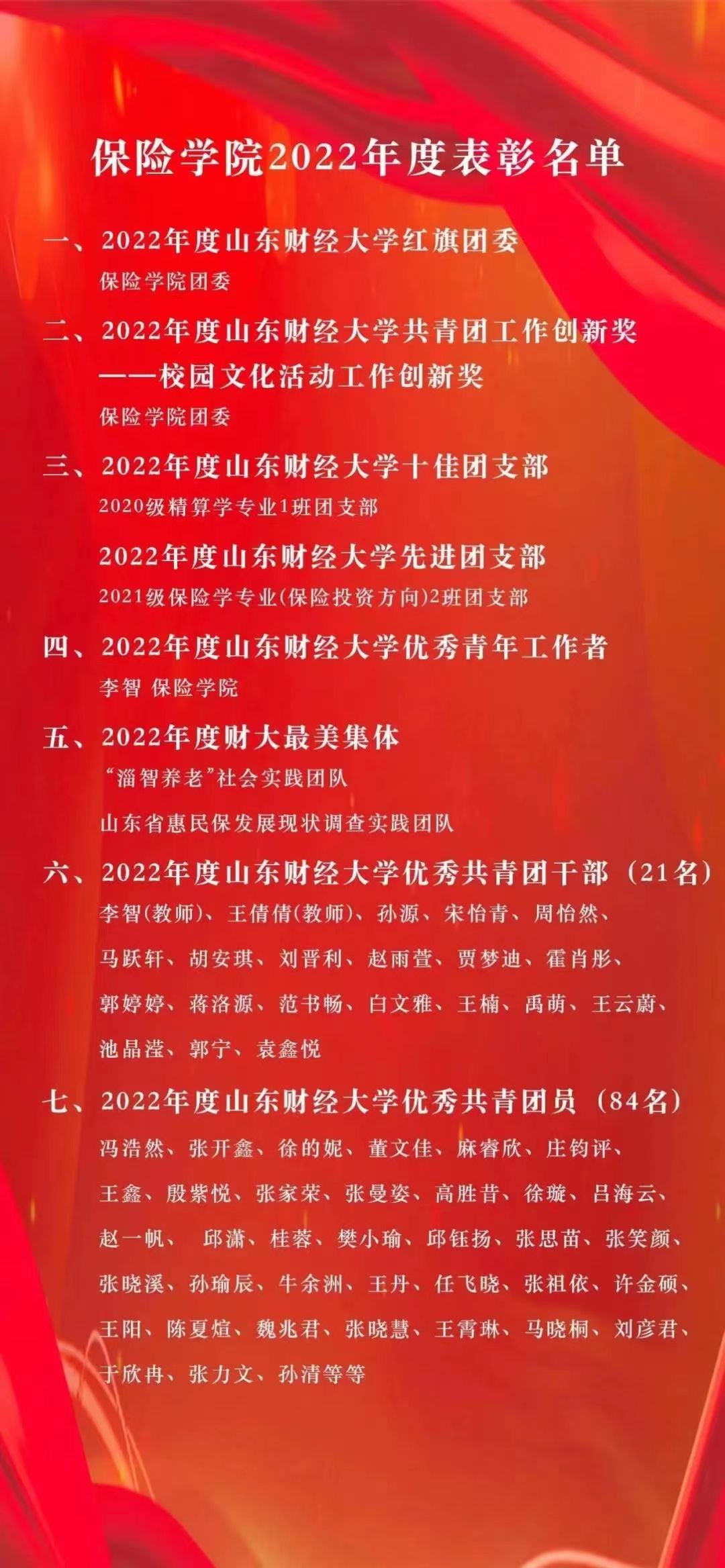 近日,2022年度新澳彩论坛 “五四评优”结果公布,新澳彩论坛共青团工作荣获多项荣誉表彰。学院团委荣获“新澳彩论坛 红旗团委”称号,这是自2019年以来新澳彩论坛连续第四次获此殊荣。此外,新澳彩论坛团委以第一名的成绩荣获“校园文化活动工作创新奖”荣誉表彰,“淄智养老”社会实践团队和山东省惠民保发展现状调查实践团队荣获“财大最美集体”称号;2020级精算学专业1班团支部荣获“新澳彩论坛 十佳团支部”称号,2021级保险学专业(保险投资方向)2班团支部荣获“新澳彩论坛 先进团支部”称号;1名教师荣获“新澳彩论坛 优秀青年工作者”称号,2名教师和19名同学荣获“新澳彩论坛 优秀共青团干部”称号,84名同学荣获“新澳彩论坛 优秀共青团员”称号。