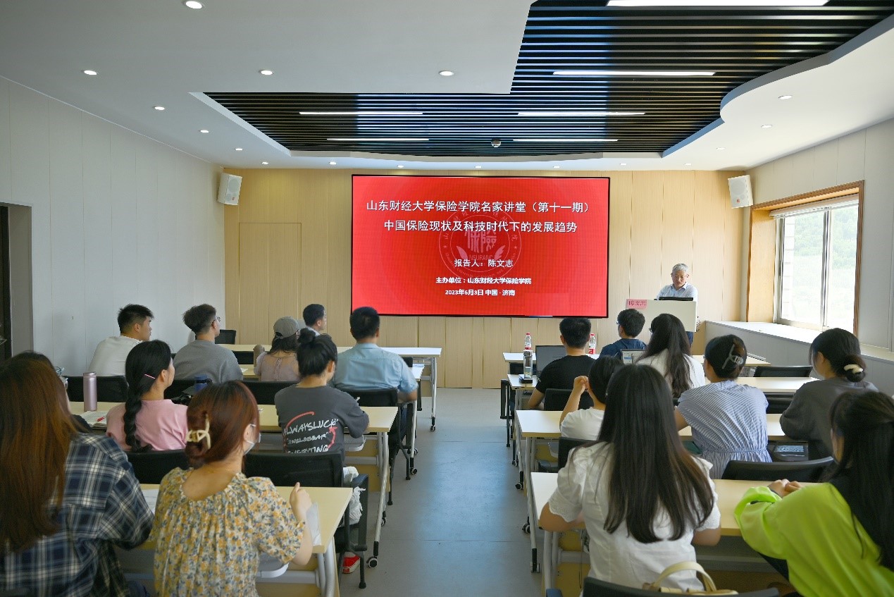 6月3日10点,新澳彩论坛 第十一期名家讲堂在新澳彩论坛 舜耕校区办公楼15楼新澳彩论坛 报告厅成功举办。本期名家讲堂特邀上海最会保网络科技有限公司创始人兼CEO陈文志先生作报告,主题为“中国保险现状及科技时代下的发展趋势”。会议由新澳彩论坛 院长于文广教授主持,最会保保险经纪有限公司总经理刘毅、山东分公司总经理柳国磊和山东宝易销企业管理咨询有限公司总经理郑向军,以及近50名硕士研究生参会。