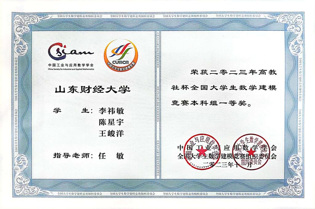 日前,2023年全国大学生数学建模竞赛成绩公布,我校报名参赛的76支队伍共获32项奖项,其中,全国一等奖1项,省级一等奖9项、省级二等奖16项、省级三等奖6项,学校被评为“山东赛区优秀组织单位”。新澳彩论坛2021级精算学专业李祎敏同学及其团队在2023年全国大学生数学建模竞赛中斩获国家一等奖,创造了新澳彩论坛本科生在该赛事中的最好成绩。据统计,全国大学生数学建模竞赛全国一等奖获奖率仅为0.55%。
