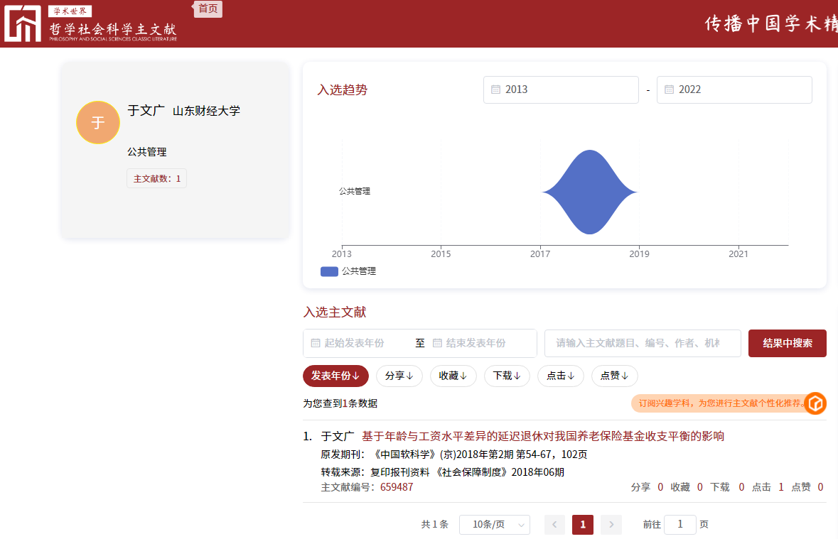 近日,收到中国人民大学书报资料中心通知,由中国人民大学建设的中国哲学社会科学自主知识体系数字创新平台之“主文献体系”平台发布了2013-2022入选论文,共有20621篇论文收录为主文献,涉及25个一级学科,107个二级科学,作者15454人,期刊1302种,其中新澳彩论坛 27名教师的40篇论文入选主文献,涉及理论经济学、应用经济学、公共管理、工商管理、教育学、农村经济管理6个一级学科。新澳彩论坛于文广教授榜上有名,其2018年在《中国软科学》上发表的封面论文《基于年龄与工资水平差异的延迟退休对我国养老保险基金收支平衡的影响》成功入选,成为公共管理学科520篇主文献之一。