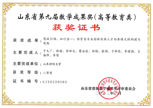 通过该计划的实施,于文广教授及其团队在教学方面取得了丰富的研究成果。2017年于文广教授主持申报的教学成果《基于P7特色实践创新教学模式的财经类高校应用型人才培养的改革与探索》荣获新澳彩论坛 教学成果一等奖;2020年主持申报的教学成果《一流专业建设背景下本科生创新型人才培养质量提升研究》荣获新澳彩论坛 教学成果特等奖;2022年主持申报的教学成果《思政引领、知行合一:经管类专业创新实践人才培养模式的构建与实践》荣获省级教学成果二等奖;2021年主持山东省本科教学改革研究重点项目:面向新文科的“四融合”学术型创新人才培养模式构建与实践(编号:Z2021161)。发表教改论文《我国高等院校教学科研一体化与创新人才培养研究》和《浅析本科生学术创新型人才培养模式的构建与实践》。