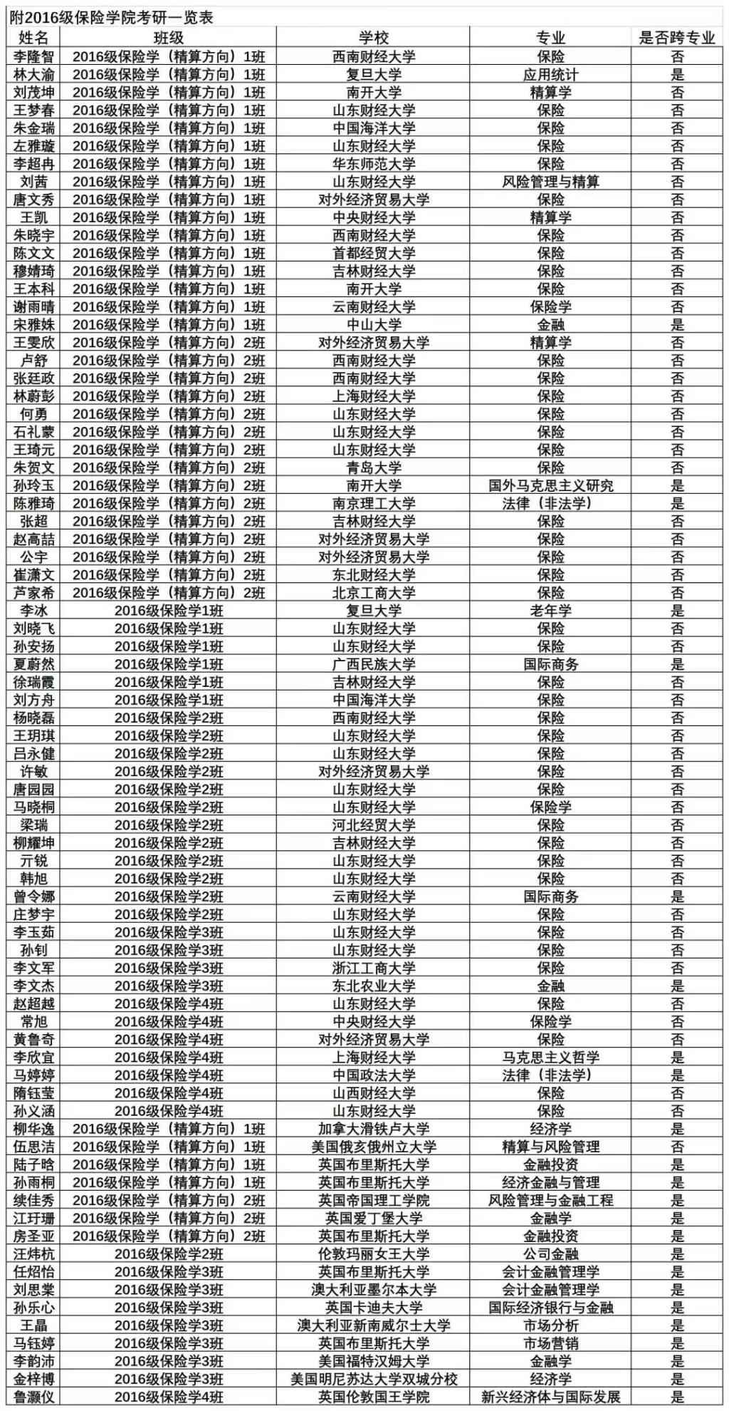 近年来,新澳彩论坛学生考研报考、录取人数逐年稳步提升,实现了学院人才培养质量的大幅提升,展现了新澳彩论坛 学子勤奋好学的钻研精神和焚膏继晷的拼搏信念,更体现了新澳彩论坛 对考研工作的高度重视、大力支持和积极引导。在这79名被录取同学中,9名考入985高校,18名考入211高校,16名考入国外知名高校,3名成功通过推免升学,录取学校包括复旦大学、南开大学、中山大学、中央财经大学、对外经济贸易大学、西南财经大学、中国政法大学、华东师范大学、中国海洋大学、上海财经大学等著名高校。此外,我校录取人数19人,占考取总人数的25%;从考取的专业来看,64名同学选择保险及金融相关专业继续深造,12名同学成功考取其他专业的研究生,保险学(精算方向)毕业生38人考取硕士研究生。