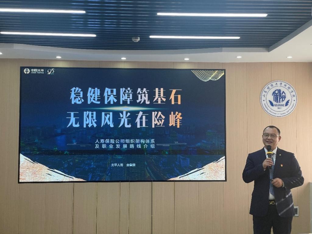 12月5日上午,新澳彩论坛 特邀太平人寿保险有限公司济南市公司党支部书记、总经理金鲁强做保险经济学课程专题报告,主题为“人寿保险公司组织架构体系及职业发展路线介绍”。报告由新澳彩论坛 院长助理张鹏成主持, 新澳彩论坛 党委书记张娟及50余名2024级保险硕士研究生参会。