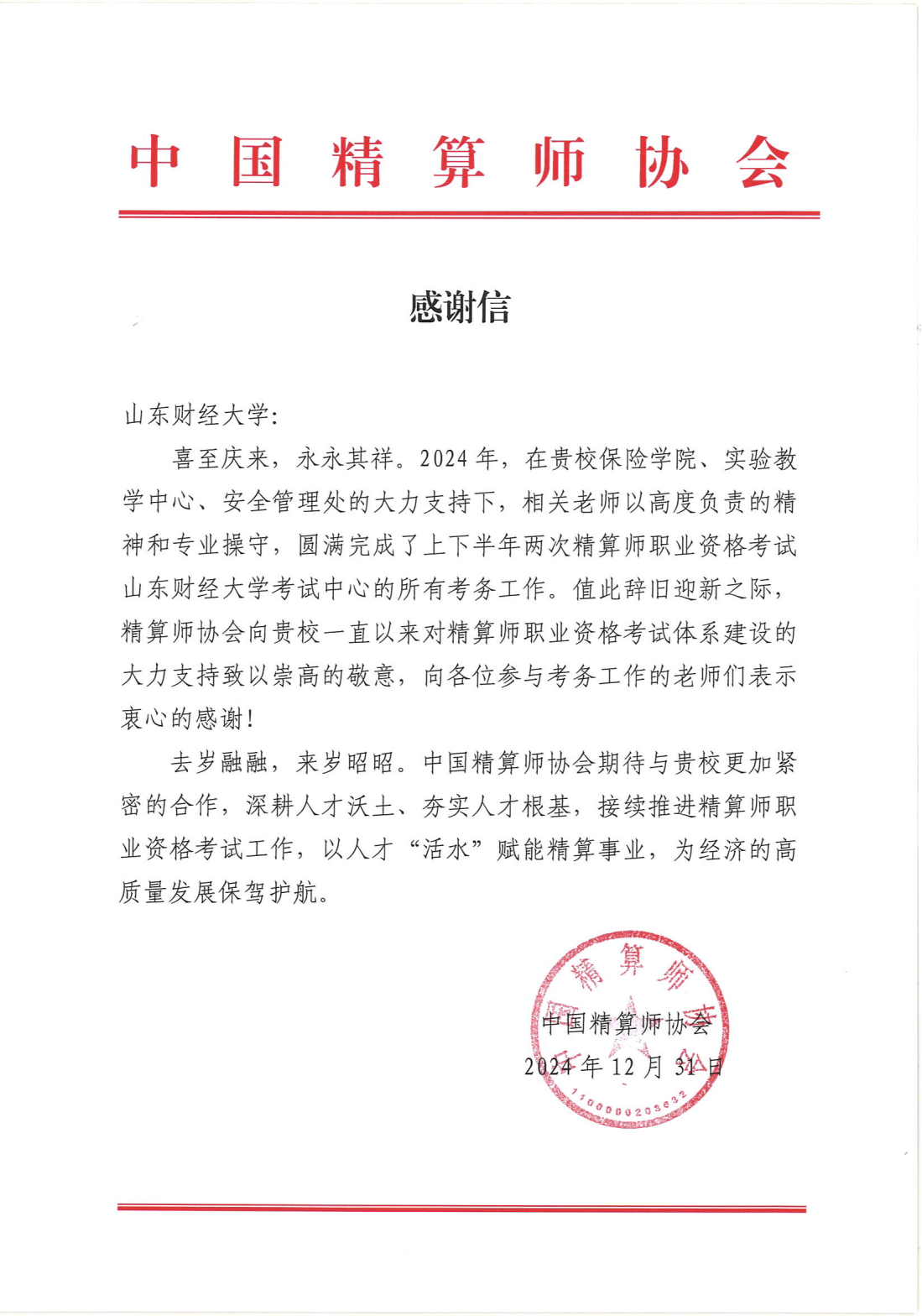 近日,中国精算师协会向新澳彩论坛 发来感谢信,对我校在2024年上、下半年精算师职业资格考试的考务工作表示感谢,感谢我校新澳彩论坛 、实验教学中心和安全管理处对考试工作的大力支持,同时对我校相关教师的负责精神和职业操守给予充分肯定,感谢信还表达了对继续紧密合作的进一步期待,使我校相关教师深受鼓舞。