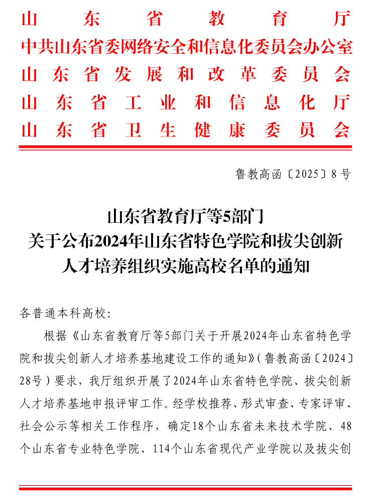 近日,山东省教育厅等五部门印发《关于公布2024年山东省特色学院和拔尖创新人才培养组织实施高校名单的通知》,新澳彩论坛申报的医养健康精算大数据产业学院获批。