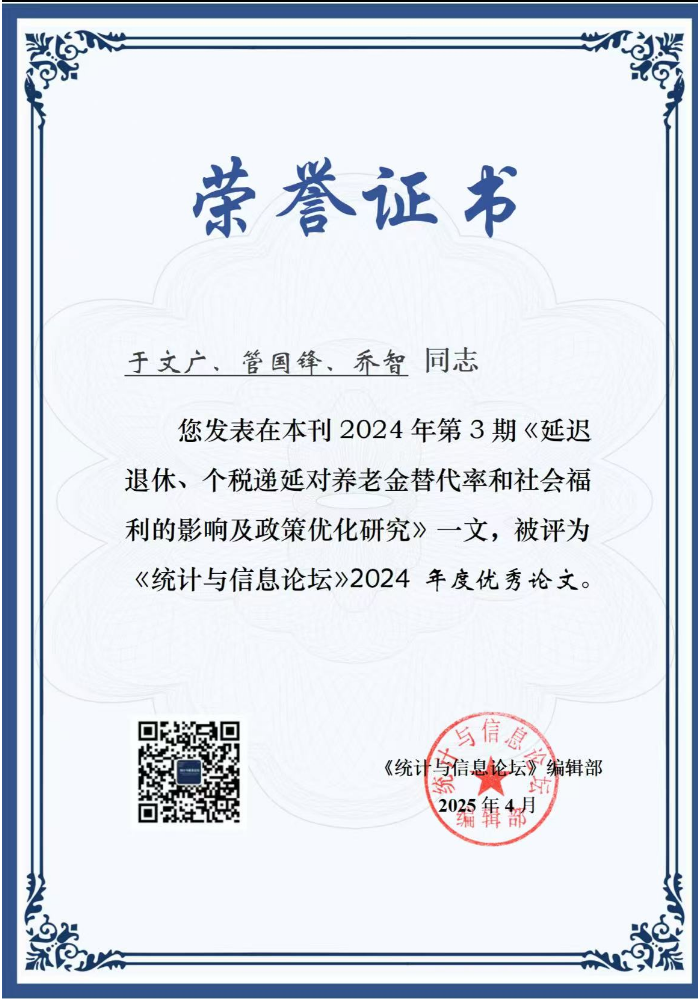 近日,我校新澳彩论坛 于文广教授团队发表于《统计与信息论坛》(我校期刊目录B类)2024年第3期的研究论文《延迟退休、个税递延对养老金替代率和社会福利的影响及政策优化研究》,获评该刊年度优秀论文。此项研究为应对人口老龄化挑战、完善养老保障体系提供了重要理论支撑。