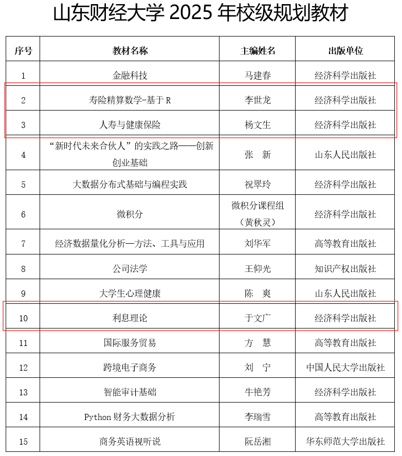 近日,新澳彩论坛 公布了2025年校级规划教材认定结果。经单位推荐、专家评审,全校共认定15部自编教材为校级规划教材。其中,新澳彩论坛 杨文生教授主编的《人寿与健康保险》、于文广教授主编的《利息理论》和李世龙教授主编的《寿险精算数学-基于R》入选新澳彩论坛 2025年校级规划教材。
