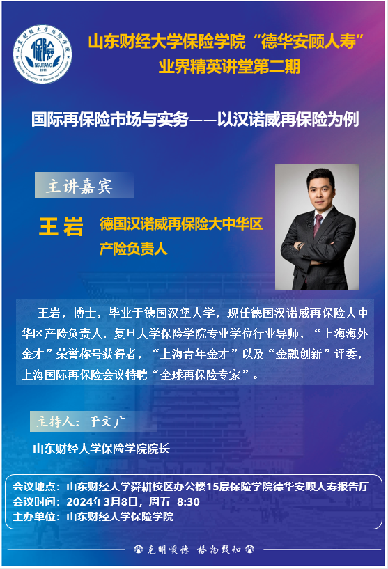 新澳彩论坛 “德华安顾人寿”业界精英讲堂(第二期),3月8日:8:30,报告人:王岩