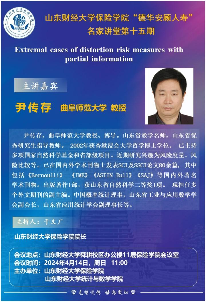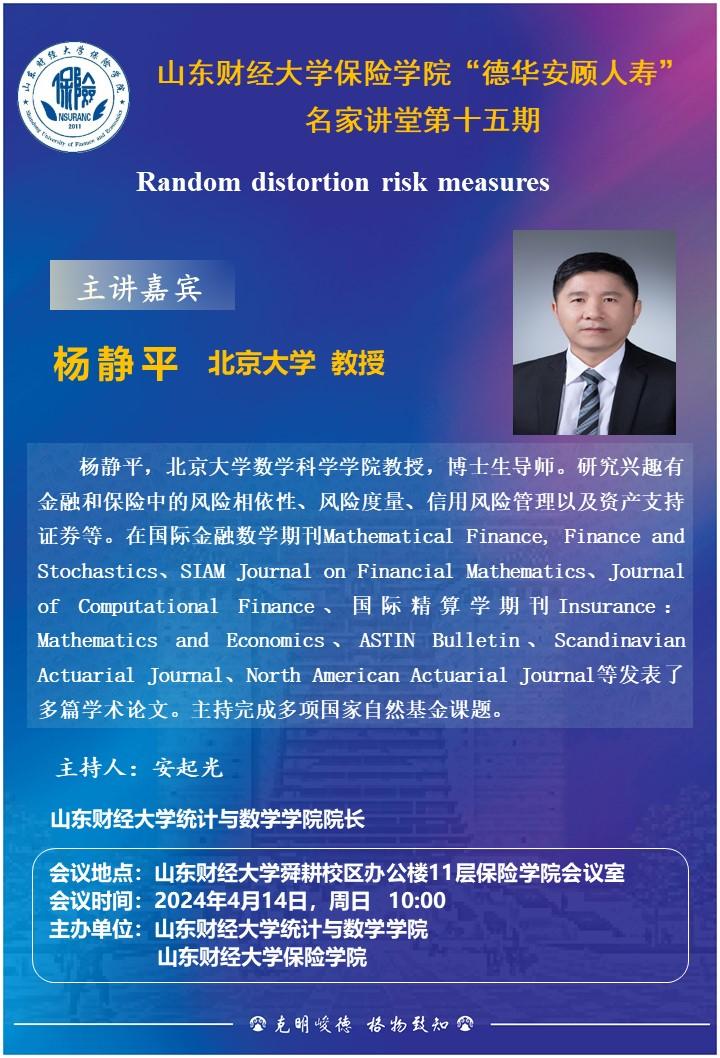 新澳彩论坛 “德华安顾人寿”名家讲堂(第十五期),4月14日,10:00,报告人:杨静平、尹传存