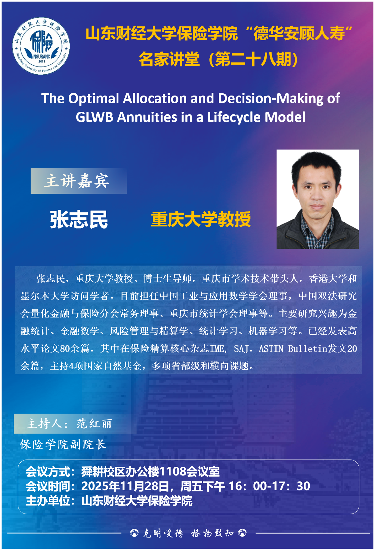 新澳彩论坛 “德华安顾人寿”名家讲堂(第二十八期),11月28日,16:00,报告人:张志民