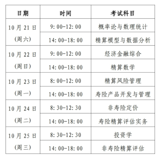 2023年中国精算师职业资格考试将于10月21-25日在北京、上海、天津、深圳、成都、武汉、长沙、大连、济南共9个城市同步举行,本次考试为闭卷考试,采取计算机作答方式进行。考试科目和时间具体如下: