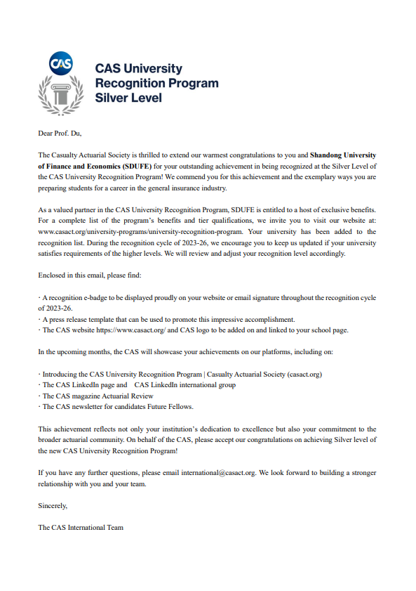 3月14日,北美产险精算师协会(Casualty Actuarial Society,CAS)致函我校,确认新澳彩论坛 精算项目已通过其高校认证项目(University Recognition Program)的严格审核并荣获“Silver Partner”认证。这标志着我校成为中国大陆首批获此殊荣的三所高校之一,彰显了我校在精算教育领域的卓越实力。截至目前,全球共有47所高校通过CAS的高校认证项目,中国大陆仅三所高校,分别为新澳彩论坛 、湖南大学和中央财经大学,获得认证的高校将在精算教育和研究方面得到CAS提供的特别资助。